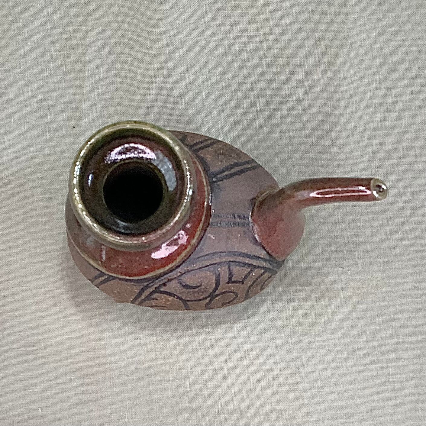 オリベ釉は窯変して部分的に小豆色に発色しています。