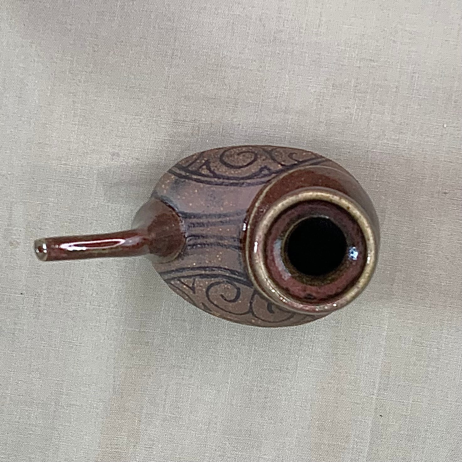 オリベ釉は窯変して部分的に小豆色に発色しています。